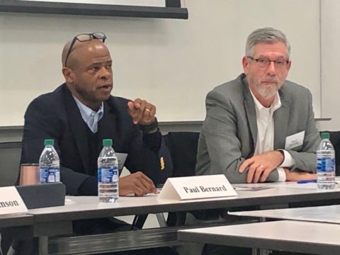 Paul Bernard and David Bell critique student proposals in the mock city council